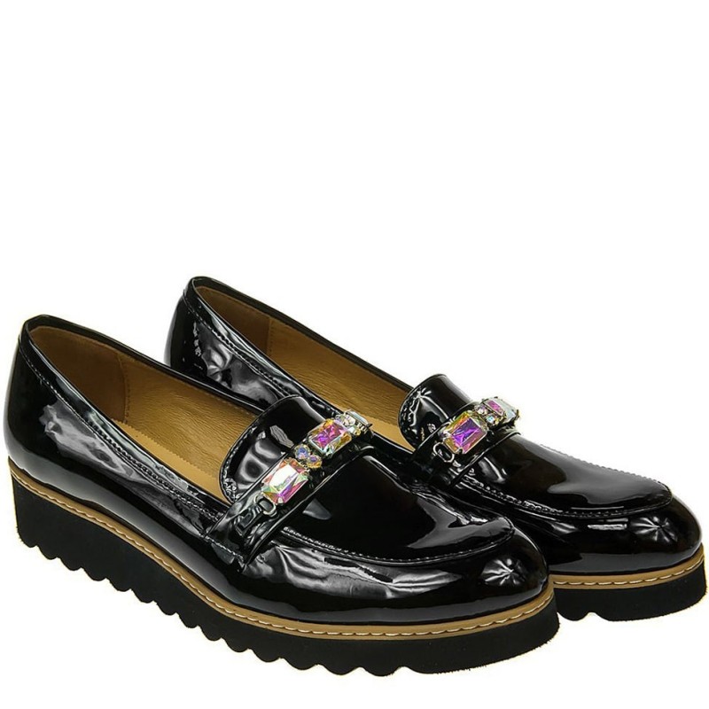 Mokasyny damskie Alexio Giorgio 471 CZLAK na koturnie ze skóry lakierowanej w czarnym kolorze